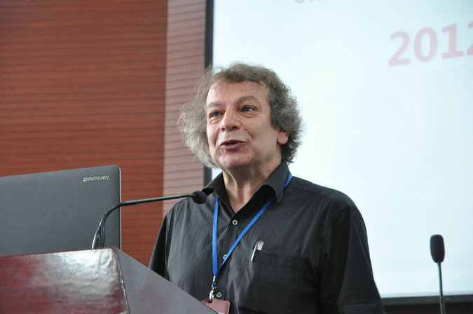图为:欧方院长范霖教授英文致辞欢迎2012级新生